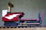 走行するのは,5インチゲージと3インチ半ゲージの車輌で,レールはデュアルゲージ(3本レール)とし,線路の総延長は約78mです。元模型少年としては,鉄道模型は自分で作るものという意識をもち続けています。したがって,線路工事も自分が納得できるものを自作することにこだわります。 可能な限り何でも自分で作りますから,この短い距離の鉄道でも多くの時間とエネルギーを費やしています。 (写真/右上)2006年12月完成,運転用ボギー車です。該当ページへ |