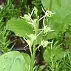 7月(上旬)![]() 梅雨空の下,林の中では自然の造りだす様々なオブジェが見られます。こんな面白い造形物の作者は誰でしょう? 1(写真左)木の上で遊んでいる小猿達がこちらに手を振っているようにも見えます。緑色で花らしくありませんがれっきとした花です。自生植物でシバザクラの絨毯が気に入ったとみえこの中で年々株が増えていきます。 2(写真右)計ってみると高さ12cm,幅7cmの「一輪挿し」 がありました。本当は軒下に下がっているのですが,撮った写真をさかさまにすると,台上に置いてあるように見えます。 ---答はこのページの末尾にあります。--- |