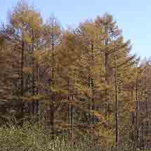 広葉樹の紅葉が終わる11月上旬に,カラマツの黄変,続いて落葉が始まります。