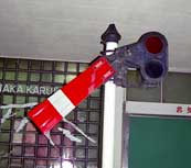 )続いて色燈式信号機(4現示式) 入換標識(きのこ型,ポイント付近 の地上に設置 されている) 赤色警報燈(踏み切りで点滅しているあの電燈) 出発合図器(ラッパ型のブザーと合図燈で構成 ,ホームの天井から下がっている) 等を選び購入した。 (左写真)信越線中軽井沢駅前にある腕木式信号機。これと同型を購入。ただし,柱は無し。柱を作る時の参考にするために撮影。 |