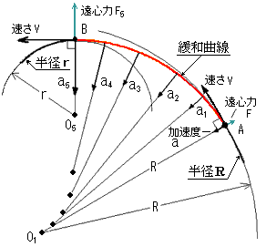そこで,別の言い方(簡単な式)に変えて曲線の形を検討してみました。ただし,話が複雑にならないように,車輌の運動は等速円運動に近似できると仮定しています。 (A)右図のように,半径Rの円軌道上のA点から,半径rの円軌道上のB点に「緩和曲線」のレールを敷く場合を考えてみます。このとき,車輌は質量mの質点とみなし,速さvは一定とします。また,曲率とは(1/半径)の値で,A点の曲率は1/R,B点の曲率は1/rとなります。 図のA点で「緩和曲線」に入りますと,A点での(向心)加速度の大きさaと遠心力の大きさFは,それぞれ となります。この式から(向心)加速度と遠心力の大きさは共に曲率(1/R)に比例していることが分かります。 したがって,曲率の変化率を一定にすれば向心加速度の大きさの変化率が一定となり,遠心力の大きさの変化率についても一定になります。 変化率が一定とは,その量が一様に増加(または減少)することを意味しますから,このレール上を走る車輌に働く遠心力の大きさは一様に変化することになります。(一様に変化することの重要性は下記補足に) 以上のことから,求める線形は曲率の変化率が一定の曲線ということになります。 まわりくどく要点だけの不十分な説明になってしまいました。すこし補足すると緩和曲線上に6点をとり,(向心)加速度のベクトルa・・・・・a5,を描いてみると上図のようになります。ベクトルの大きさ(矢の長さ)と曲率が比例しています。 遠心力F,F5のベクトル(青矢印)も同様で,いずれも向心加速度と反対の向きで大きさは向心加速度の大きさに比例しています。 |
