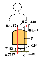 補足 *1遠心力を解消させることは不可能ですが,私達はカーブに入り遠心力を受けると反射的に向心力を得る為に体を内側に傾け重心移動を行います。模型車輌に乗った状態でこの重心移動を行なうとレールの外軌側から内軌側に荷重の配分比率が変わります。この荷重配分を変える(=重心を移動する)ことは重要な意味をもちます。 遠心力Fと重力Wの関係は右図の様になり ,カーブ外側への転覆は外軌レール上の点Pを軸とする遠心力のモーメント=F×y に関係し,遠心力の大きさに合わせてカーブ内側への重心移動をすれば重力のモーメント=W×x が増加 してより大きな遠心力に対抗できることになります。 (注) 「遠心力のモーメント」=点Pを回転軸にして車体を時計回りに回転させるのに「遠心力が果たす効果」の意。説明の必要上日常使われない用語「モーメント」を使いました。 (注) よく知られていることですが,外軌の外側に転覆しない条件は遠心力Fと重力Wのモーメント について F×y≦W×x となります。 ●カーブを曲がるためには遠心力のモーメントへの対抗手段が必要です。実際の鉄道では内−外軌間での体重移動などあり得ない要素ですが,カント=0の庭園鉄道では重要な要素になっていると思います。 結論的に言えば,実際の鉄道はカントによって,庭園鉄道は重心移動(=重力のモーメントを増すこと)で遠心力(のモーメント)に対抗します。 一方,庭園鉄道では高い位置に重心Gがありyも大きく,カーブを意識しすぎて重心を大きく移動させる(=図のxがx>ゲージ幅の状態なる)と危険です。重心移動を意識せず2本のレールの中心に正しい姿勢で乗ることを心掛ければ自然に(=適正に)この荷重配分が行われると思います。 一様に遠心力を増加させる線形にレールを敷設することによって,身体的な対応が自然に行なわれ,無意識な動作(=重心移動)を有効に使ってカントに頼らない遠心力への対抗手段にする。・・・という発想がこの「緩和曲線」です。 (2005.2,2008.11追記) |