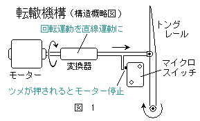 庭園鉄道の分岐器は安全性の点からは手動で転轍すると作動状況も確認することになり,不具合や操作ミスを避けることが出来ると思います。一方,手動の転轍は分岐器の手前で車輛から降りて必要な操作をしなければならず,頻繁な転轍を要する場合はかなり面倒です。 今回,分岐器3台を配置したデルタ線を敷設することになり,それを機会に遠隔操作で3ヶ所の分岐器を統括して転轍する方法を考えてみました。 複数の分岐器を統括して転轍するにはリレー回路や電子回路を利用するのが普通かもしれませんが,より単純な方法によって制御します。 トングレールを動かす部分の概略は上図1のようになります。この図には描かれていませんが駆動するモーターの電源回路を2電源にするという一風変わった工夫をしてみました。作動の要点は次の3点です。 @モーターの右回転/左回転を転轍棒の右移動/左移動に変えます。(上図,右回転➔右移動) A転轍棒を右移動/左移動させるモーターの回転方向は逆転スイッチでは無く,2つの電源を使用することでモーター端子の極性を反転します。 Bモーターが回りトングレールが定位置に達するとマイクロスイッチがモーター電流をOFFにし転轍が完了します。このとき,モーターを逆回転させる回路は2電源の内の別電源ではたらくのでこの回路のモーター電流をONにすればトングレールは反対側に移動します。(このON-OFFの動作を繰り返して左右にポイントを切り替えます。) |