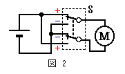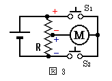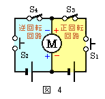 直流モーターを逆回転させるにはモーター端子の極性を反転させればよいので,通常は右図2のように2回路2接点のスイッチSを使って逆転します。このスイッチSを使う方法で遠隔操作をするのは大変で,スイッチSをリレー等に置き換えなければなりません。 複雑なことをするには複雑な回路が必要とは限りません。単純な回路で複雑なことができるようにするのがベストです。そこでリレーや2回路2接点の逆転スイッチを使わず,1回路1接点の押しボタンスイッチの開閉でモーターを逆回転させる方法を考えてみました。 電位差計のことが頭に浮かび,抵抗線上の2点間の電位差を利用できないかと思い,左図3のような回路を描いてみました。抵抗線Rの両端と中央の3点の電位差を利用すればモーターを逆回転させることができます。 押しボタンスイッチS1を押したときは図の赤字の+と−,S2を押したときは青字の+と−がモーターにかかり(印加され)ますから,モーター端子の極性が反転します 。 この回路の問題点は抵抗線Rに無駄な電流を流していることで,微弱な電流ならともかく,1A程度になるモーター電流ではロスが大きく実用性がありません。 あれこれ堂々巡りした末,「何だ,簡単!」と一気に解決しました。図3の抵抗線を電池に替えれば同じはたらきになります。迷路に踏み込んだのは電源は1つという固定観念から抜け出せなかったのが原因です。 押しボタンを押して転轍する時間は10秒弱なので必要な電力はごくわずかです。モーターまで長いコードを延ばす電源では不経済で,単3程度の電池をモーターの傍に置く 方が簡単です。電池を2倍使う2電源でも単3なら数や容積の点でそれ程問題になりません。 図4は図3を2電源に変えた回路です。スイッチS1を押