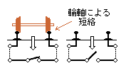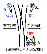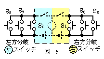 モーター回路を正回転用と逆回転用に分離してあれば押しボタンスイッチを増設するだけで複数の箇所から遠隔操作することができます。遠隔操作するための複雑な電子回路やリレー回路,多極スイッチなどを必要とせず,1個の押しボタンスイッチによって同じはたらきをさせます。 乗車したままで分岐器を転轍するためには押しボタンスイッチを右図のように3ヶ所に設置します。 背向(鉄道用語)側には1個ずつ,対向(鉄道用語)側には2個設けます。 図中の○内の文字は各ボタンが左−右に転轍する向きです。 これらの押しボタンスイッチの回路はごく単純で図5の様になります。STEP2に描いた図4の押しボタンスイッチS1,S2と並列にスイッチS5〜S8を接続するだけなので,これ以上簡単な回路はないと思います。 図5の電池の極性と分岐方向は仮に描いたもので,分電池の極性と転轍方向の関係は自由に変えられます。 図5のスイッチ数には制約が無く,更に増やしてコードを延ばせば転轍機から遠く離れた複数の場所から転轍操作が行えます。 電気転轍器を押しボタンのON-OFFのみで作動させる方式は車輌の輪軸(鉄道用語)による自動転轍も可能にします。 分岐器への背向側からの進入は転轍方向が決まっていますから押しボタンスイッチは1個だけです。 そこで押しボタンスイッチの代りに輪軸を利用し,レール間を輪軸が短絡する状態をスイッチ「閉」,車輌の侵入が無い場合をスイッチ「開」にすれば,自動転轍を行うことが出来ます。右図の様にレール間を輪軸が短絡する状態がスイッチを閉じる操作になります。実際の設置には一定区間の片側のレールを電気的に絶縁する工事が必要で絶縁した継目板などを使います。金属枕木の軌きょうには採用できませんから,自動転轍には車輌を感知して入切するスイッチなどに置き換えます。 |