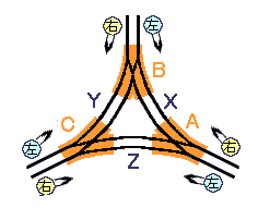 ごく狭い範囲に設置されたデルタ線や渡り線では,列車の進行方向に続く分岐器の転轍に整合性が必要です。例えば,右図のようなデルタ線(X,Y,Z線)では下表のような組み合わせでA,B,Cの分岐器を転轍します。 (図の説明) いま,Aの分岐器からX線に車輛が進む場合,Aの分岐器は右方分岐に転轍します。この転轍操作を自動的にBの分岐器にも反映させてBを左方分岐に転轍してしまえば,1回の転轍操作でX線が通過できます。 同じ方法をY線,Z線についてもとり入れ転轍の間違いによる脱線や分岐器の破損を無くします。 |