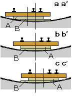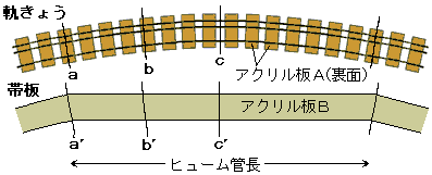 (説明)枕木板の裏には板よりひとまわり小さな長方形のアクリル板Aが取り付けてあります。このアクリル板Aの下にアクリル板Bを入れ,線a,b,cと線a’,b’,c’が一致する位置で固定します。 円形の軌きょうを直線状のアクリル板Bに重ねるわけですから,軌きょうの中心線とアクリル板Bの中心線は一致せず,上の断面図の様に相対的に左右に振れます。この 振れがあっても,A,Bの幅と高さを適正に決めますと,レール面を低く水平に保った状態で軌道が設置できます。 |