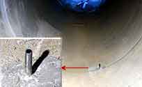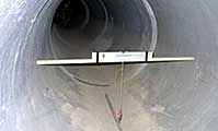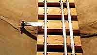 ヒューム管の軸の位置を測定 円筒の管内に潜りこんで頭を下げた姿勢は水平,鉛直の感覚を鈍らせます。そこで,軌道設置の基準になるヒューム管の軸位置を調べておくことが大切です。 <製作メモ>長さ120cm弱の水平な棒の中心点に「下げ振り」を付け,軸の位置を管底にマークしました。軸位置を確認せずに目測で製作して作り直しの失敗もしました。 |