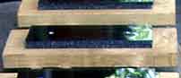 <製作メモ>アクリル板Bを高さ調整に使いながら,アクリル板Aで枕木を水平に支えるという考え方です。板Aは2枚重ね(厚さ10mm),板Bは1枚(厚さ5mm)で す。 写真/アクリル板Aを軌きょう裏面に皿ネジで留めました。 板A,Bで高さ15mmになり,枕木が濡れる心配はほとんどありません。 |