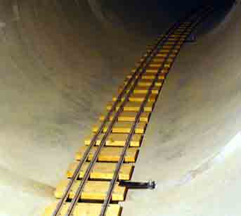 トンネル内の軌道設計で重視したのは,次の4点です。 (1)水の滲み出しと凍結に耐える構造にする。モルタル,コンクリートは水が溜まると壊れます。 (2)軌道面を極力低くする。天井が低いので乗客が頭を擦らないようにします。 (3)メンテナンスが要らない軌道にする。狭いトンネル内は作業が大変です。 (4)音の響も含めて,出来るだけ実感的な軌道にする。設置後も改良が必要です。 軌道の形 トンネル内のレールは全体的には半径40m程度の円軌道です。ただ,一部に半径15mの部分もあり一定していません。 ヒューム管を並べたトンネルは円形ではなく多角形になります。接続部には角が出来ますがごく僅かです。 暗闇の中でライトに照らされて光るレールは滑らかな曲線を描いてこそレールであり,鉄道の美の典型です。この曲線の決め方は私と鉄道模型>隧道内の線路に記しました。 道床と枕木 軌きょうを載せる路盤はヒューム管を利用しているので平面ではなく,円筒面(の内面)になっています。 円筒内面に弓形に湾曲した曲線軌きょうを直接載せることは出来ませんから,まず,これを解決しなければなりません。 ※ヒューム管の底にモルタルで水平な路盤を作れる場合ば簡単です。しかし,この方法はレール面が高くなることと凍結すると剥離するおそれもあるので採用できません。 この問題に対処するために下図のような道床(=土台)を考えてみました。 アクリル板を使い,上下2段構造の台板A,Bを組み合わせて軌きょうを水平に保ちます。 ※アクリル板の代わりに合板を使用すれば価格的には1/10程度ですがカビの発生や腐朽の点に問題があり,強度,防水,耐久性などに優れたアクリル板にしました。 |