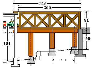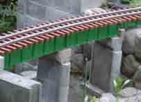 そばな高原鉄道の橋梁 山中の庭園鉄道では「本物」の山や谷を克服しなければなりません。したがって,橋梁も景観のためというよりは,橋梁本来の役割を果たすために架けています。 窪地を横断するため(高架橋),通路の頭上を通過するため(跨道橋),排水溝を跨ぐため(橋梁),それぞれの設置目的に合わせてデザインだけではなく実用性も兼ね備えていなければなりません。 |