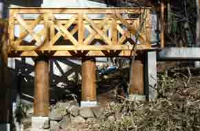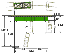 一本の丸太をそのまま橋脚にし,鉄材を使用しない方法で造りましたので実際の鉄道の橋梁とはかなり異なったデザイン,構造になりました。 |