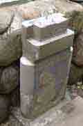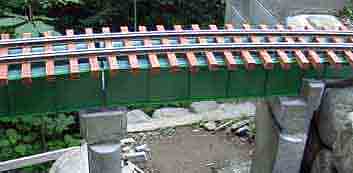 の目地が目立つのは日本的な鉄道景観には馴染まず,レンガを壊してコンクリート製の感じに造り直しました。写真上は製作中の橋脚で,手前正面のモルタルを塗り始めました。左右側面には10cm重量ブロック2段積みを芯にしてアールをつけた装飾的なコンクリートを打ちました。 上路プレートガーダー橋には転落防止対策が必要です。 この鉄橋でも橋脚の左右のアール(丸み)部分は安全柵の支柱を立てる予定でした。ところが,この位置では鉄橋に近すぎるので,安全対策を他の方法で考えます。 写真下,完成した橋脚です。 |