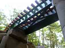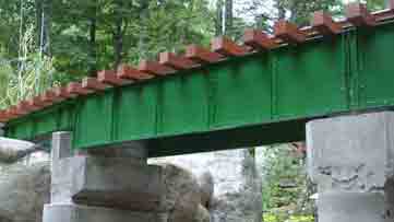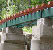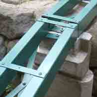 鉄橋の組立 ● 橋脚の上に荷重を支える角型鋼管の橋桁を取り付けたところです。橋桁は径10mmのアンカーボルトを使用して橋台・橋脚に固定しています。(左写真