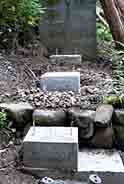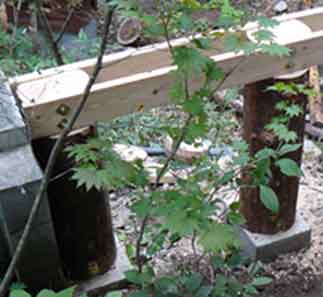 基礎工事 橋梁本体と通過車輌の重量は橋脚1本あたり150kg程度になり,凍結にも耐える必要があるので基礎部分はそれなりに頑丈に造りました。(右写真) 美観と腐食を防ぐ2点から基礎の形を決めました。橋脚が太い丸太なので基礎の上面はかなり広い面になっています。 右写真の奥に見えるブロック積(高架線2の橋脚)を第2橋梁の橋台として利用します。(左図) 丸太(橋脚)と基礎の結合は基礎コンクリートの中に径12mmの羽子板付きボルトを埋め込み,長さ240mmのボルトを通して丸太(橋脚)を固定します。 |