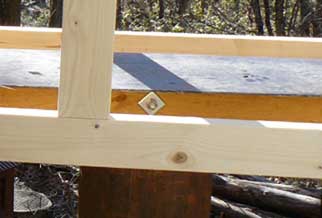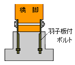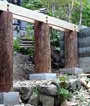 橋桁の取り付け 橋桁は2×6,SPF材を平行に並べ,橋桁の頭部に2本のボルトで取り付けます。(写真)ボルト穴を開け仮組した状態です。ボルトは長さ240mm,径12mmです。 ![]() |