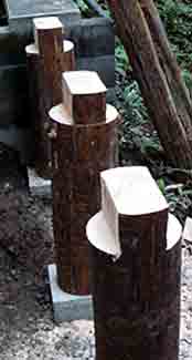 橋脚の製作![]() (右写真) 直径が270mm〜290mmのカラマツの丸太を基礎の上に立てて固定し,水糸を張って切り取る線を記入します。 ![]() (左写真) チェーンソーで丸太の頭の高さを揃え,橋桁を取付ける切込みを入れたところです。 この後,電気ドリルで12mmのボルトを通す穴を開けます。 穴が長いので一方向から正しい位置にドリルを貫通させるのは困難です。 正しい位置の左右から中央付近まで穴を開け,改めて正しい位置を一直線に貫通するように ドリルを通しました。 |