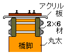 道床(アクリル板)の取り付け![]() SPF,2×6材を平行に並べた縦桁だけでも軌きょうを載せられる程度の平面度が得られますが,より広い幅で安定した平面を得るためにアクリル板を敷きました。(右図) (構造) 実物のプレートガーダー橋の構造は平行に並んだ2本の縦桁の上に枕木が跨って載っていますが,アクリル板を桁の上に渡しコンクリート道床の上に軌きょうが載った高架橋の形に近くします。(下写真) (効果)