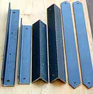 橋桁には部品Eが8枚必要ですが,末端の1枚はアングルの部品Dの向きを180°回すのでサイズも変わります。 (下写真/左)出来上がった部品C,D,Eです。部品Dの巾3mmの溝はディスクグラインダーでカットすれば簡単に作れます。 (下写真/右)部品CをDに差込んだときの状態です。結合は5mmのネジ止めです。 |