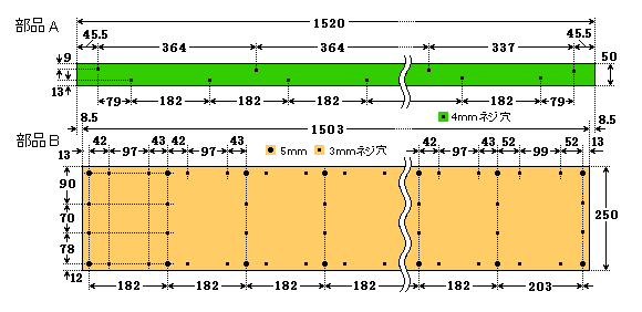 3 フランジと腹板![]() ● フランジ(右図,部品A) 巾50mm,厚さ3mmのフラットバーで作りました。フランジは主桁枠と横桁枠に跨る形になるので,上下のフランジでも主桁枠と横桁枠とを結合します。 実際のプレートガーダー橋に比べてフランジの巾が広いので左右の鈑桁(橋梁用語)のずれ(レール方向)を防ぐ働きをさせて鉄橋が変形しないようにします。鉄橋を真上から見ると主桁と横桁が長方形をつくりますが,対角線の位置に横構を入れてトラス構造(三角形)にし,変形を防ぎます。 第3橋梁ではこのフランジに横構の代わりもさせるので上から見ても三角形(トラス構造)がありません。 フランジに枕木を載せたときネジの頭があると邪魔になります。そのため上側のフランジは4mmの皿ネジ止めにする予定でしたが,板厚が薄いので取り止めです。 (写真) 製作したフランジです。鉄橋の材料に使ったフラットバーやアングルは以前はどこのホームセンターにもあった材料ですがこの頃は素材からの施工が減っているのか販売している店が少なくなってきました。 資材としての需要減が原因とすると,鉄道模型と同じように「手づくり」が廃れて「既成品」の組立てに移行しているのかもしれません。 下図はフランジ(部品A)と腹板(部品B)のサイズと孔 あけ位置です。 |