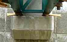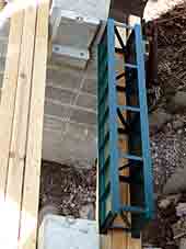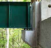 ● 橋桁の固定 橋桁を橋台に固定するのは支承ではなく橋桁の上端に取付けた金具です。(左写真)取付金具は完成した橋台に合わせて形 が決まるので少し不細工な形状になりました。 金具の橋台への取り付けはボルトです。ボルトに大きな力がかかっても耐えられるように,太さ3/8インチの寸切りボルトをコンクリート中に深く埋め込みました。(右写真)金具で橋桁を橋台に固定した状態です。 上に載せる軌きょうが当らない様にボルトの頭 は低く下げてあります。 |