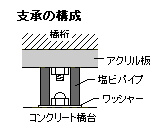 ● 支承の製作![]() 橋桁を橋台に仮置きし支承の位置と高さを決めるための測定をしました。 素人が巻尺と水平器のみを測定具にしてコンクリート工事をしているので4点の支承位置は設計どおりには造れません。工事完了後の位置で現物合わせの支承を作ります。 (右写真)楔形の木片を挟んで橋桁を水平にし,支障の高さと橋桁底部の支承位置を決めています。楔形の木片はシックネスゲージの代用になり,測定しにくい箇所ですが正確に支承の高さが分かります。 測定結果は高架線3側の支承の高さは左右共に12mm,高架線4側の支承の高さは21mmと22mmにすればよいことが分かりました。3側と4側との高さ10mmの差は3,4の橋台のコンクリートを打つときに生じた誤差です。 実際の鉄橋のような形に支承を作りたいのですが高さ調整と固定方法が上手くいきません。結局,塩ビパイプを使った支承にしました。支承1ヶ所あたり15〜150kg重程度の加重がかかります。強度的には塩ビパイプでも耐えられると思います。 左図が支承の構成です。機能的には固定支承で,高さ調節は塩ビパイプの切断長で簡単に変えられます。 塩ビパイプの中に上下からナットの頭を入れるだけですが橋桁の自重が大きく外れることはありません。 |