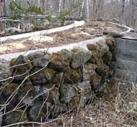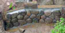 擁壁の作り方(築堤の土留め) 傾斜が急で土が崩れる斜面では擁壁を作ります。材料は玉石,割栗石,セメント,砂,砂利,砕石などです。 (造り方は工事現場を覗き見して真似をしただけのDIYの自己流です。) 1 擁壁の基礎 割栗石を地面に打ち込み,その上に型枠を置きコンクリートを打ちます。(右写真:上)2 石積み(1段目) 基礎コンクリートの上に玉石を隙間が空かないように組み合わせて並べます。石の裏面に板を立てて,板で石を支えると安定します。石と板との隙間にコンクリートを打ちます。 (ポイント) 石とコンクリートを密着させることが大切で石を水で濡らすとか,場所によってコンクリートの硬さを変えるとか工夫してしっかりと突き込 みます。 3 裏込め コンクリートが固まったら,裏の板を引き上げ,壁の裏側に水抜きの為の玉石や砕石(砂利)を入れます。 4 石積み(2段目以降) 1段目と同じ作業をくり返して高くしていきます。最終段は石の上端が揃うように石の大きさや形を選び,積み終わったら,天端が滑らかになるようにモルタルで仕上げると綺麗になります。 (右写真:下) 3段目まで積んだところ,背中の板は積む毎に引き上げていきます。板と石の隙間はコンクリート,後側には水抜き用の玉石や砂利を入れます。 5 排水対策 高く積む場合は,1段目から2〜3段毎に壁の裏から表まで水が抜ける様に塩ビのパイプを石の間に通してからコンクリートを打ちます。 |