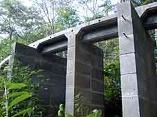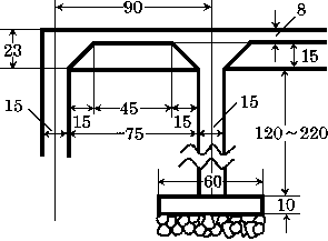 高架線2 橋長 4.65m,径間1.05mのラーメン構造.橋脚 高さ40cm〜140cm,重量 ブロック造. 橋床(路盤)巾40cmのコンクリート版(Slab)(断面は右図) 製作 2002年8月 工事に慣れてきたので日数的には以外に早く完成しました。ただ,コールド・ジョイントが出来ないように1日でコンクリートを打つために朝4時半頃から作業をはじめ,1立方m弱のコンクリートを日没までに連続して打つ作業はかなり疲れました。(錬るのには体力,打つのには時間を要します。) この高架線とこれに続く区間は高原鉄道の最も長い直線軌道の区間です。 高架線2の工事の様子を |