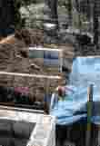 (4)橋脚工事![]() ブロックは1日 に2段以内しか積めないので,奥の橋脚が出来上がる前に,手前の橋脚の基礎工事も始めています。 |