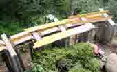(1)橋脚工事![]() 橋脚の高さ ブロック6段〜11段積です. (ブロック1段は高さ20cm) 橋床の重量に耐えるように,既設の大橋脚の間に小橋脚を増設し径間を1/2にすることにしました. |