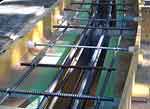 (3)型枠工事 ![]() 底板の上に台形の型枠を5個2列並べて側板でこれらを挟んでいます. 側板が適度な硬さなのでセパレータで締めると,橋床はなめらかな弧を描きます. |