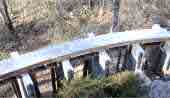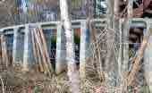 高架橋(3)の工事について 橋脚を同一円周上に一定間隔で並べたかったのですが,高低差がある上に,円の中心からの距離を直接測れない橋脚もあって,円周の半径は5cm程度の誤差 が出てしまいました。 写真(2)の一番手前に写っている第2橋脚の更に手前に第1橋脚があり,この第1,第2橋脚は冬の凍結で傾いたことがあります。この2つの橋脚の基礎周りに,コンクリートを 追加して打ち傾きを修正しています。地面の凍結は重量物も簡単に持ち上げますので基礎を深くする必要があります。 |