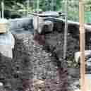 平行な「ブロック塀」の間に発泡スチロールを入れます。発泡スチロールは面が広く厚みのあるものが良いのですが,カットして隙間が出来ないように詰めていけば小片でも使えます。上にコンクリートを打ったときに潰れない強度 が必要です。 発泡スチロールの間には後で電線を通すための電線管入れていきます。 右写真左側に橙色に写っているのが2本の電線管の接続部(引き出し口)です。 |
