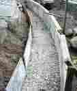 路盤工事 (2) この線(テープ)の両側に2本の杭(水杭,右図中の棒A)を2m位 空けて立て,双方の杭に電子水準器で正確に基準水平面の高さをマーク(ベンチマーク)していきます。 (3) この杭のマークの位置に棒(水貫,右図中のB)を水平に取り付けて鳥居形を作ります。 この棒は作業の邪魔になることも多く,頻繁に外します。水杭や水貫の実際の様子は下の写真の随所に写っています. この(2)、(3)の作業は手間と時間がかかっても同一の水平面上に軌条を敷設するためには手抜き ができません。 |