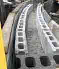 1段目を積みます。「ブロック塀」を間隔20cmで並べたような形になります。ブロックの円弧の半径とブロックの水平を正確に測りながら1段目が積めれば2段目の作業は楽に進みます。 |