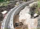 型枠を線路の形に設置し,厚さ7〜10cm,巾50cmのコンクリートの基礎を作ります。急曲線でなければ緩和曲線は無視します。基礎コンクリートの上面の高さは水貫から正確に測りながら作業します。 |