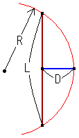 の関係が成り立ちます。 たとえば,長さL=100cmの定規を円形レールに当て, 中央50cmの位置でレールとの距離がD=1cmであったとすると, 上式に代入して円形レールの半径はR=1250cm=12.50mとなります。このとき,D=1cmはR=1250cmに比べて十分小さい値ですから近似計算で十分です。 |