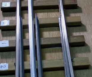 トングレールとノーズレールは磨耗や衝撃に耐えられる様に鉄レールを使用しました。 この2つのレールの形が分岐器の機能を左右しますから,どのように作るかがかぎです。 |
