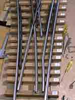 加工が済んだレールを塗装して枕木に取り付けます。分解や調整が必要になる箇所はネジ留めにして取り外し出来るようにし,それ以外は見かけも重視して犬釘を使いました。 1本のレールを異なる軌間の車輌が共用するので,双方の軌間に合致する線形をつくる必要があり,どの順番にレールを取り付けるかも考える必要があります。 |