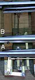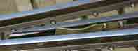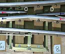 トングレールA(5インチゲージ)とB(3インチ半ゲージ)とを直接つな いだ場合,A,B間を正しい間隔に調整しないと圧着力に差が生じ ます。 そこでA,Bに力を等しく配分し,基本レールに圧着させる構造になっています。 (左写真)3本の