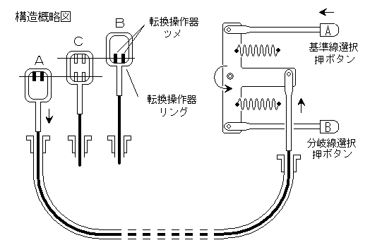 不適切な方向からの進入があるとトングレールが対応して動き脱線を防ぎます。 具体的には次のA〜Cの操作をワイヤーシャフトを使って行います。