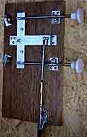 走りながら前方のポイントを切り変える方法として,ワイヤーシャフトを使うことを思いつきました。 ワイヤーシャフトは買うつもりでしたが意外に身近にありました。古自転車のブレーキに付いています。ブレーキとは機能が異なるのでワイヤーをピアノ線に変え廃物の再利用をしています。 問題点はワイヤーシャフトの摩擦力が想像以上に大きく,操作に力がいることでした。 ●転轍押しボタン・・・・白色陶器製のつまみを4mmの真鍮棒にネジを切って取り付けてあります。 本物の鉄道用押しボタンスイッチと言っても信用されそうです。(ホームセンターで@147円です)(上写真)