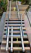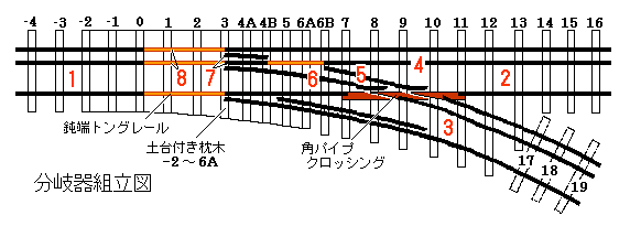 レールを枕木に固定するのは径3mm,長さ10mmのネジ(ワッシャーヘッド)です。整形の段階で取り付け位置のネジ穴も開けますが,ネジを枕木にねじ込む角度でレールの固定位置を少しずらすことが出来ます。場所によっては1mm位の補正も可能なので一度組立ててから再度取付け直すこともやっています。ネジ穴が大きくなりすぎたり修正が上手く出来ないときはネジの長さを16mmのものに変えたり,枕木をひっくり返して新規にネジ穴を開け直す方法もとります。 組立作業は場所をとるので屋外で行い,作業台は4×4材の柱をテーブルの上に平行に2本並べてその上で組立てました。2本の柱は分岐器の形に合わせてV字形にも出来るのでとても良い作業台になります。 下図が組立てる分岐器の全体図です。尖端トングレール分岐器の場合,左右両端のレールが長い1本のレール(=主レール+基本レール)なので一体化できますが,鈍端トングレール分岐器ではこの長いレールがありません。 3つの部分から構成し,土台付き枕木部分を挟んで2つの軌きょうを前後から取付けます。組立の手順も通常と異なり,下図赤数字の順番に組み立てます。 鈍端トングレールは転轍する機構と共に取付けるので組立は一番最後になります。