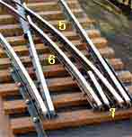 注 分岐器2台(右方分岐と左方分岐)を同時に組立てて写真を撮りましたので左右双方の写真が混ざっています。製作順番号1,5,6,7の写真は左方分岐,2,3,4と上の写真は右方分岐の分岐器です。 |