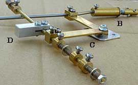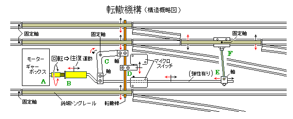 動力源 転轍の動力源としては電磁石,モーターの使用を検討しました。電磁石によってリンクされた4本のレールを瞬時に動かすには大型の磁石が必要になることと局所的に強い力がかかるのでモーターでゆっくり動かす方法にしました。 使用できる小型モーターは回転数が大きく,市販のギヤボックス(注1)を利用して回転数を下げます。 取付位置 転轍機構を取り付ける場所(=鈍端トングレールの位置)はアクリル板に薄型枕木を載せた部分と一致します。アクリル板は取付け台に も利用でき好都合です。レール間は狭いので転轍機構は細長く分散して載せます。