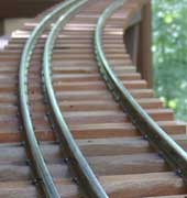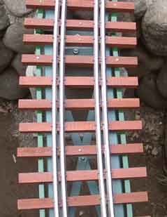 実感的な線路は鉄道模型の景観の一つに加えたいものです。現在はコンクリート製の枕木が主流になりましたが,やはり鉄道の景観 は木の枕木と犬釘の組み合わせに捨てがたい魅力があります。 そばな高原鉄道ではこの従来タイプの軌きょうを製作し,敷設しています。 |