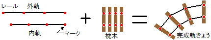 そばな高原鉄道の築堤上には外軌の半径6m85cm(内軌の半径6m72cm)の軌きょうが設置されています。 この軌きょうを〈私と鉄道模型(9)〉枕木の間隔と線路の形に記した方法で製作する過程をご紹介します。 製作方法の概略 下図のように,内軌と外軌に計算で求めた枕木位置をマークします。この位置に枕木を取り付けると目的の形の線路になるという単純な方法です。