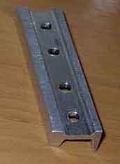 レールの側面を削った継ぎ目板用のジグ。(ジグの溝に,加工した材料をはめて穴を開けます。) |