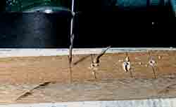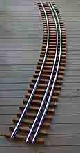 ボール盤(またはハンドドリル),金槌,釘締 ●材料費・・・・犬釘1本2.8円,6角頭 ボルト1本6円,フランジナット1個2.5円 ●製作時間・・・・曲線軌きょう(3mに付き),レール塗装約30分,犬釘打ち約5時間 ●余談・・・・犬釘を打つ下穴の数は3mの軌きょうで234になります。始めは手持ちの電動ドリルを使いましたが,精度が悪く腕も痛くなるのでボール盤に切り替えました。コツが分かると高精度 ・短時間の作業になり,時間を計ってみると枕木25本150穴が15分のペースでした。 |