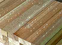 軌きょうの組立 (1) ボール盤を使い犬釘を打つ下穴をあけます。この穴は枕木に描いたレール位置の線に外接し強くレールを挟む位置にあけます。穴は刃先の径1.5mm以下の木工用の細いキリで深さ18mm位が適当です。堅木は釘による割れの心配がほとんど無く写真の様に一直線上に下穴をあけました。釘を直線上に並べないで変形を防ぐ組み立て方も試しましたが,効果に比べ作業に手間がかかり,レールと枕木の直交性の点では逆に狂いがで易いので止めました。
